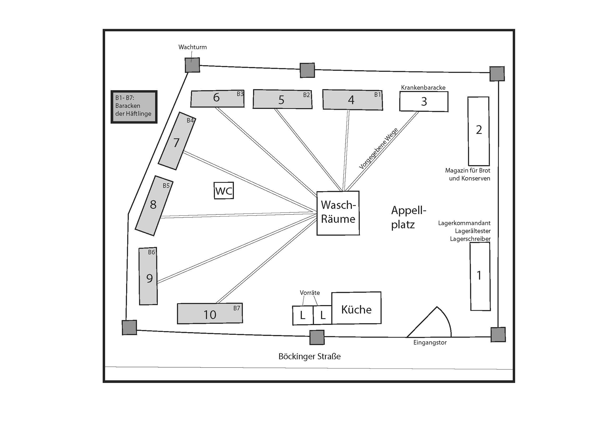 Vier Wachtürme und ein doppelter Stacheldrahtzaun sollten die Flucht der Gefangene verhindern. Gegenüber der Kommandanturbaracke, in der auch der Lagerälteste und weitere Funktionshäftlinge ihren „Dienst“ taten, fällt links vom Eingang an der Böllinger Straße eine große Küchenbaracke mit Anbau ins Auge. Außer einer Vorrats- und einer Krankenbaracke sowie Waschgelegenheiten waren für die Häftlinge sieben rund zwanzig Meter lange Baracken ohne Heizung bestimmt. In diesen waren mit wechselnder Belegung wegen der Tag- und Nachtschichten zwischen 150 und 200 Häftlinge eingepfercht. Sie schliefen auf mehrstöckigen Holzpritschen mit Strohsäcken. Nach kurzem Schlaf begann das immer gleiche Ritual als Auftakt einer langen Arbeitsschicht: