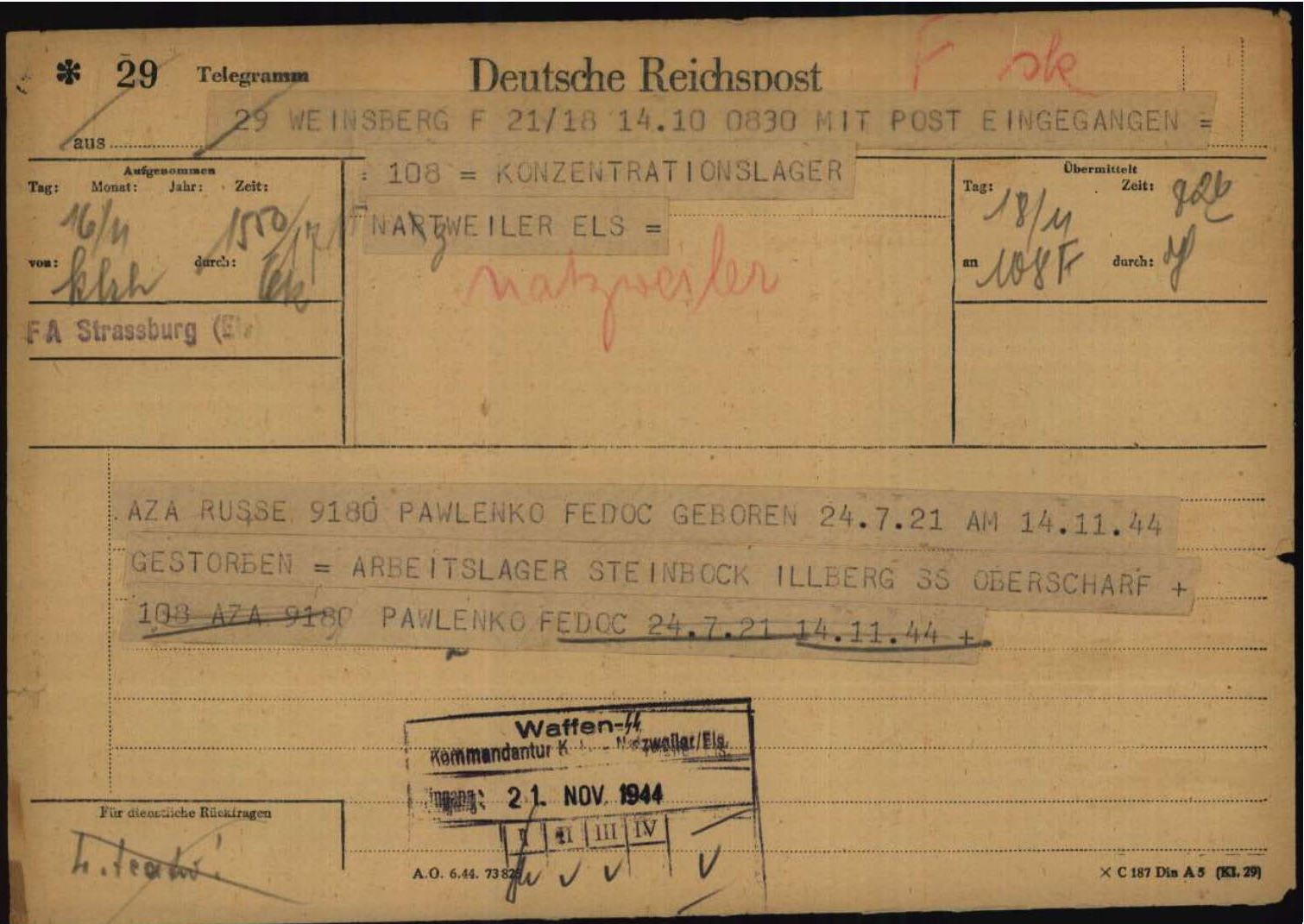 Hierarchisch eingebunden war das sog. „SS-Arbeitslager ‚Steinbock‘“ (ein Deckname für das Rüstungs-Verlagerungsprojekt im Salzbergwerk) in die Kommandantur des Hauptlagers Natzweiler. Die wurde nach dem Heranrücken der Amerikaner Ende November nach Nordbaden und später von der Front weiter weg verlegt. Noch am 16. November 1944, wenige Tage vor der Verlegung über den Rhein, ließ der Neckargartacher Lagerkommandant Gillberg per Telegramm den Tod des russischen Häftlings Fedor Pawlenko (im Dokument falsch geschrieben) über Straßburg nach Natzweiler melden.