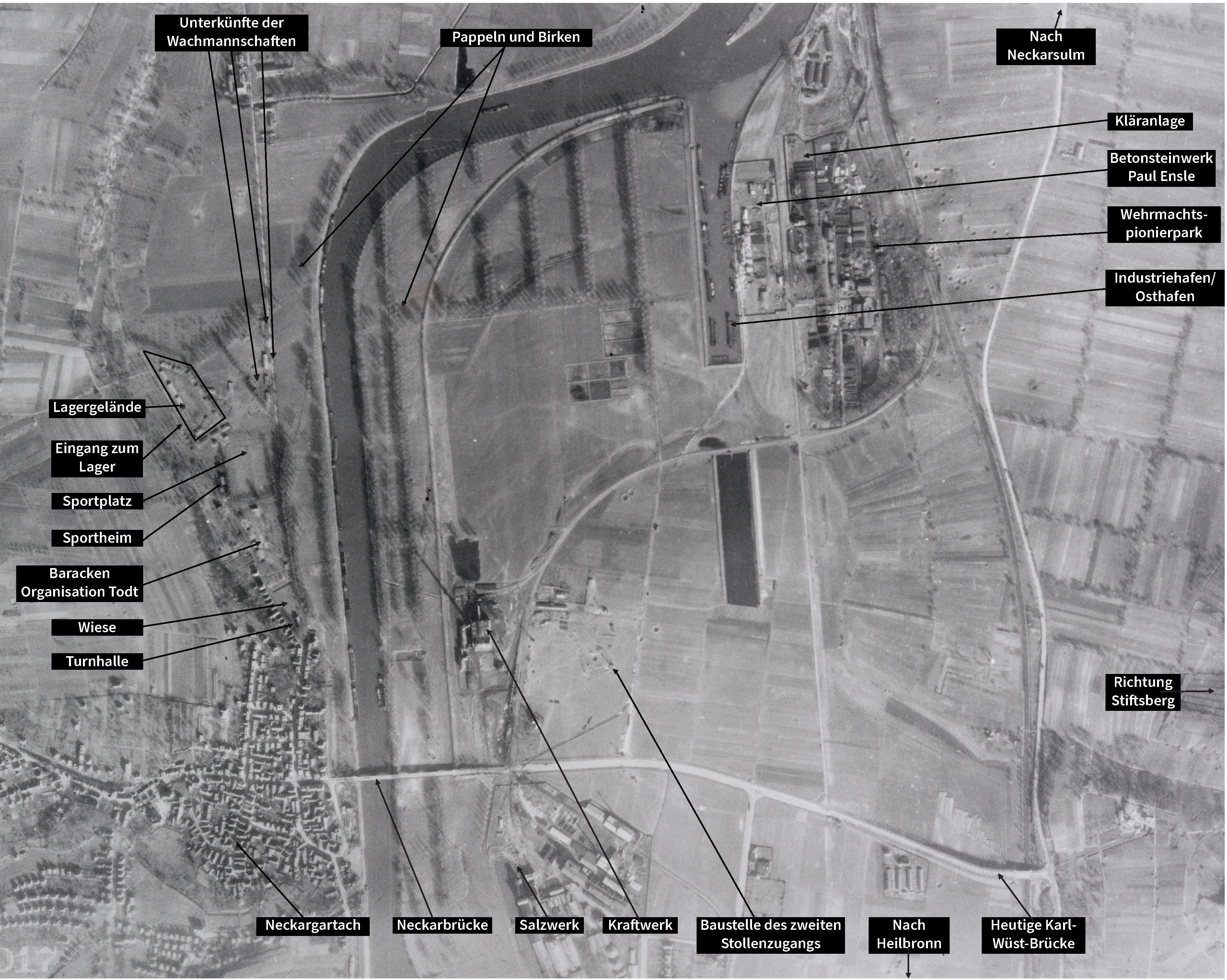 “Die Neckargartacher waren nicht wenig erstaunt, als eines Tages im September 1944 an der Böllinger Straße beim Sportplatz 19 große Baracken und einige kleinere Wirtschaftsgebäude erstellt wurden. […] Das Rätsel [, wer hier einziehen sollte,] löste sich, als das Ganze […] nach wenigen Tagen mit Männern belegt wurde, die an ihren zebragestreiften Hosen und Kitteln unschwer als KZ-Häftlinge zu erkennen waren.” (Steinhilber 1960)