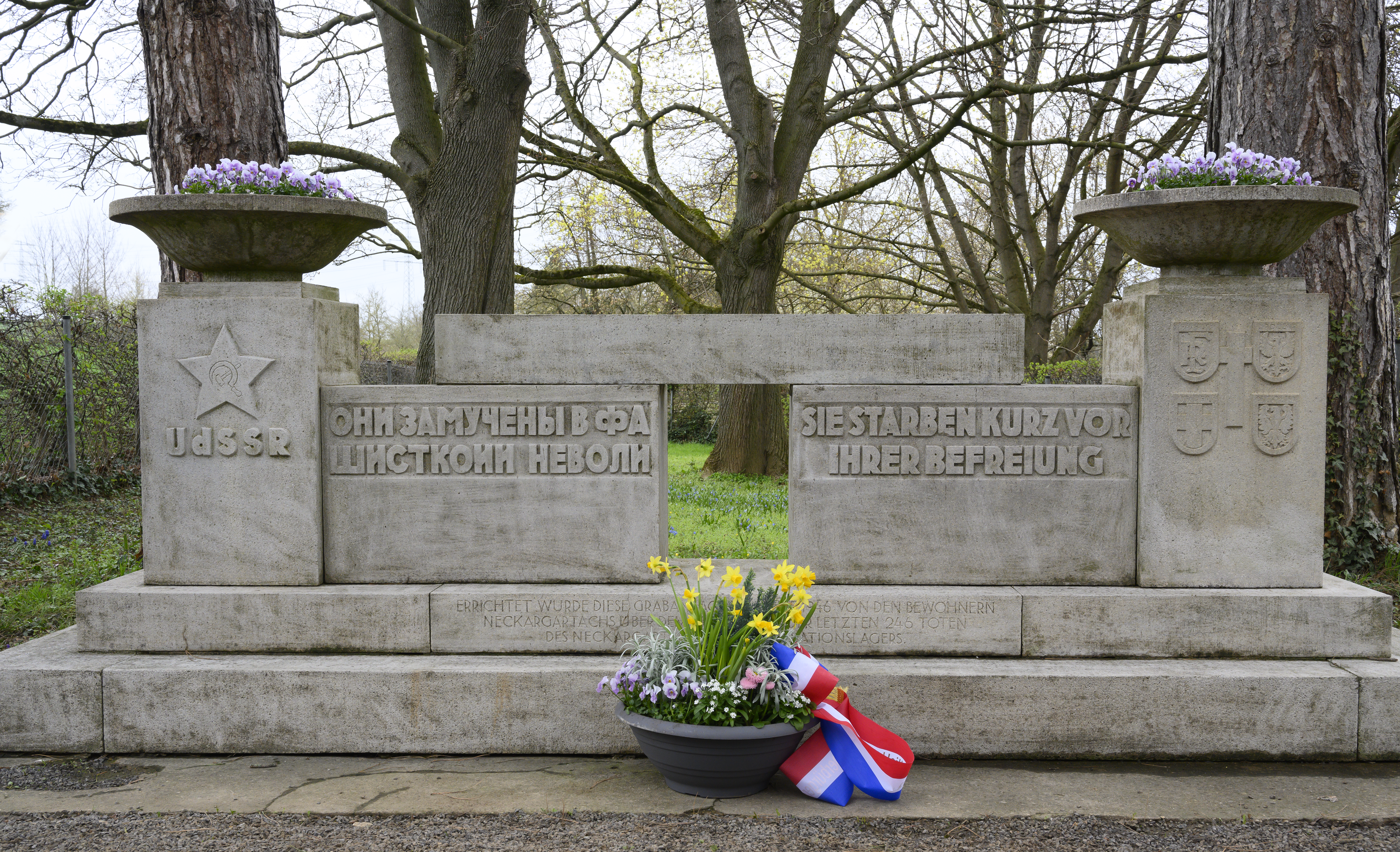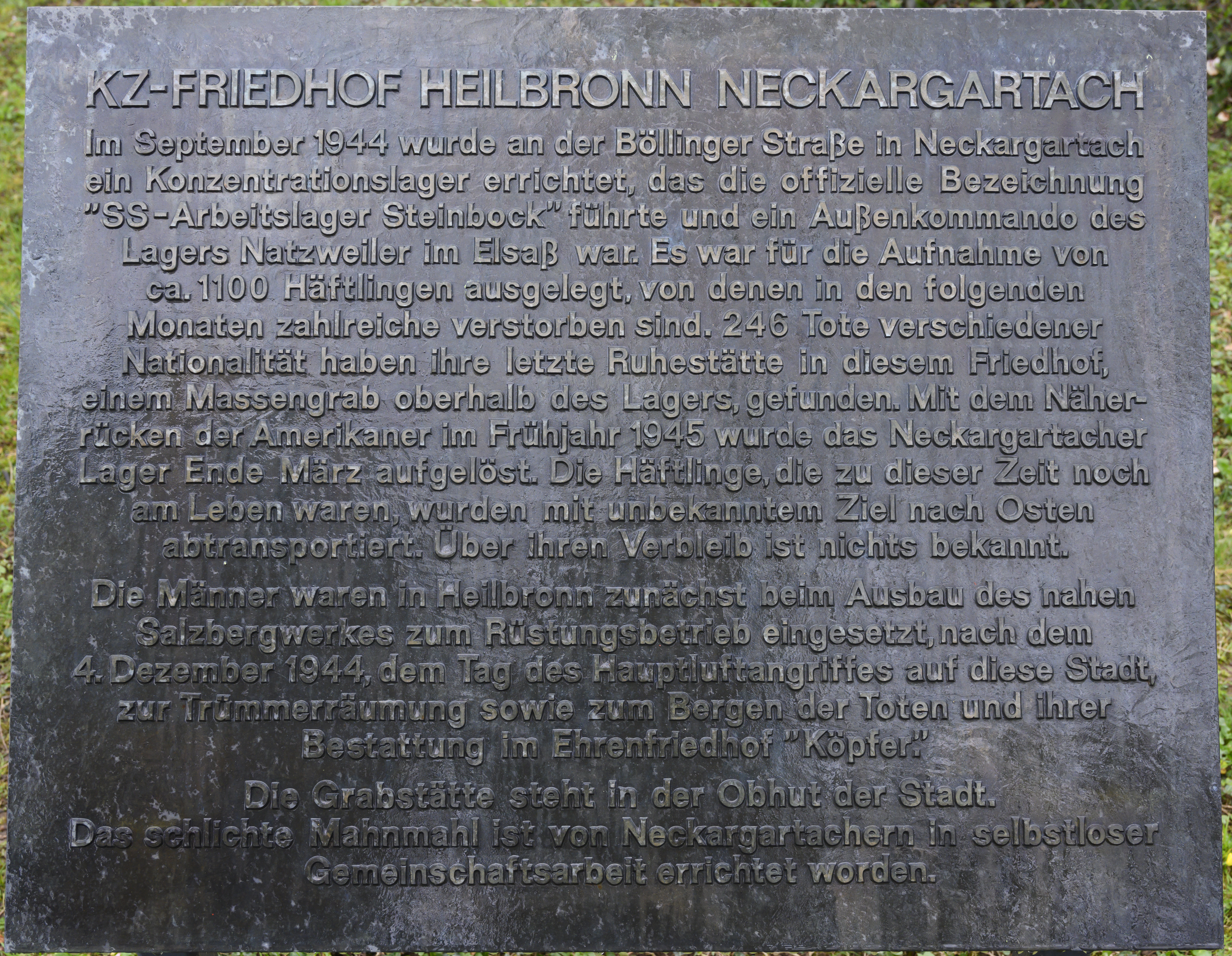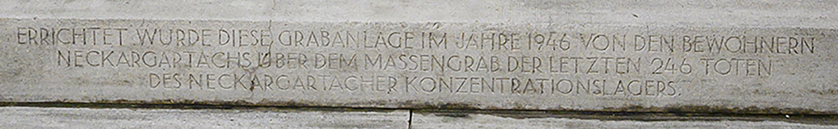 Die zentrale Inschrift am Sockel lautet: „Errichtet wurde diese Grabanlage im Jahre 1946 von den Bewohnern Neckargartachs über dem Massengrab der letzten 246 Toten des Neckargartacher Konzentrationslagers.“ Rechts und links ist jeweils eine Inschrift angebracht, die sich inhaltlich unterscheiden: Während auf der rechten Seite auf Deutsch „Sie starben kurz vor ihrer Befreiung“ zu lesen ist, heißt es links in kyrillischen Buchstaben: „Sie wurden zu Tode gequält in der faschistischen Gefangenschaft“. Auf der linken Seite ist das Wappen der Sowjetunion mit dem Schriftzug UdSSR abgebildet, auf der rechten Seite gruppiert um ein Kreuz die Wappen der Länder Frankreich, Polen, Italien und Deutschland – vermutlich als Hinweis auf die fünf häufigsten Herkunftsländer der Opfer.