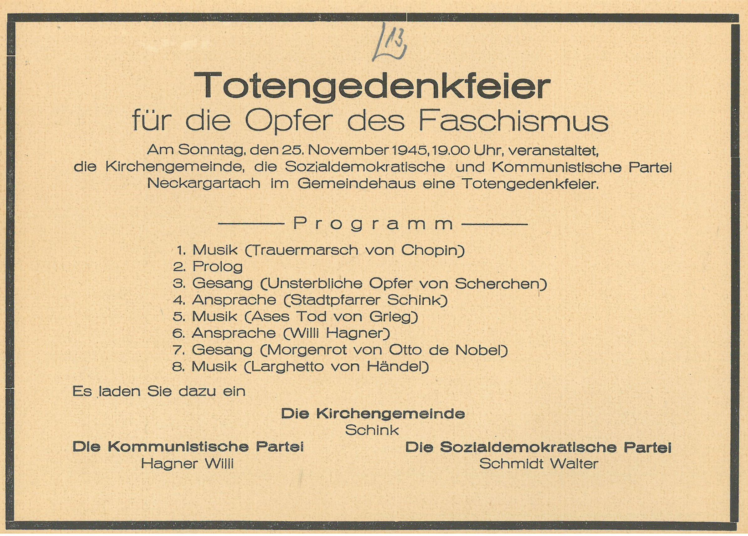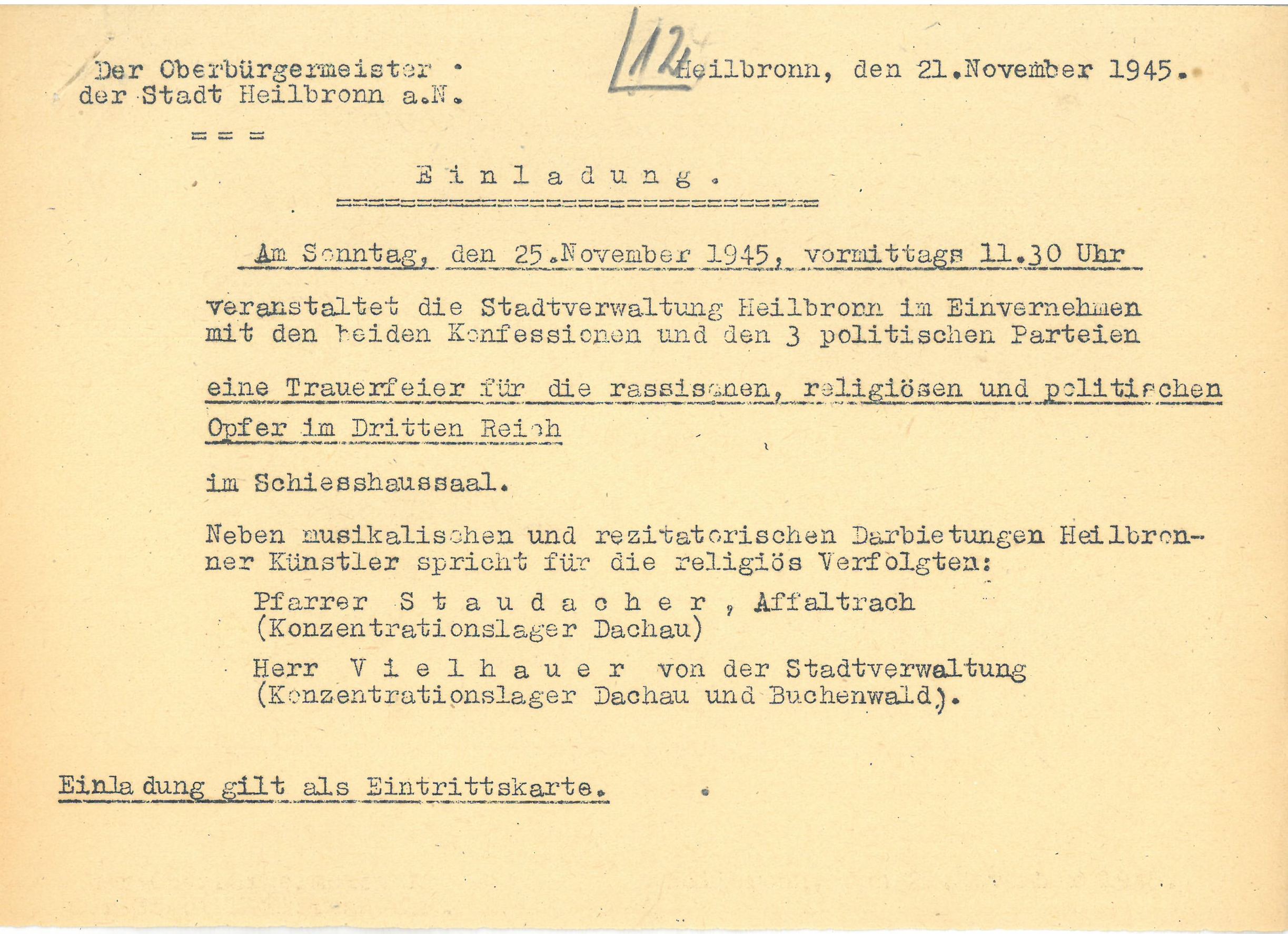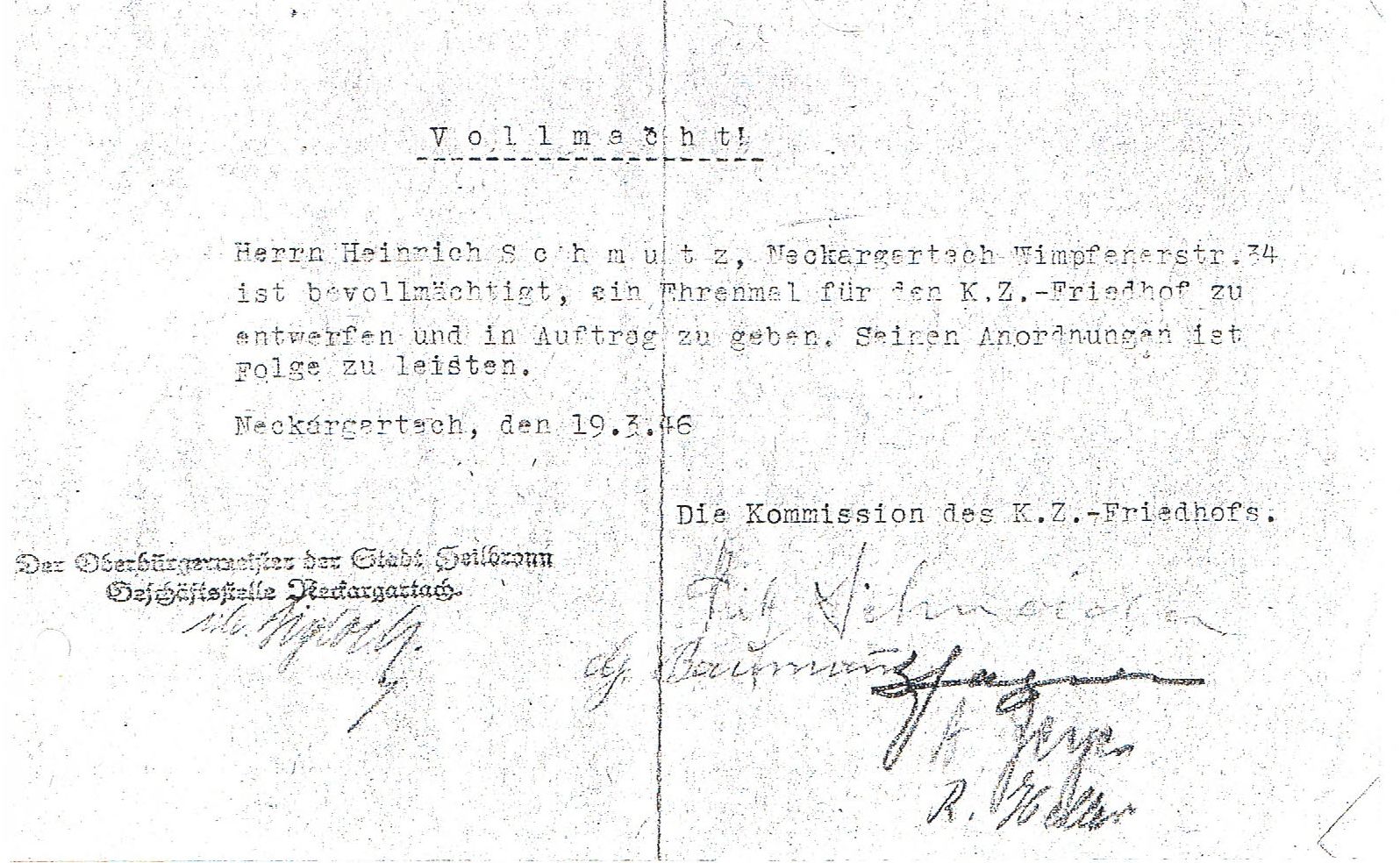 Im Frühjahr beantragte er über den Heilbronner Oberbürgermeister Emil Beutinger bei der US-Militärregierung die Erlaubnis für eine Sammlung zur Errichtung eines Denkmals auf dem KZ-Friedhof oberhalb der Böllinger Straße. Hierzu reichte Walter Vielhauer, damals stellvertretender Oberbürgermeister, Unterlagen ein, die ein Foto der Anlage, damals noch mit einem Holzkreuz, vom Frühjahr 1946 zeigen. Der Bewuchs, etwa mit Magnolien im Eingangsbereich, belegt, dass die Neckargartacher Bevölkerung schon vor dem Frühjahr 1946 den Friedhof gestaltet hatte. Dies ist eine überaus frühe Form des Gedenkens an KZ-Opfer im deutschen Südwesten, wie der Historiker Marco Brenneisen recherchiert hat.