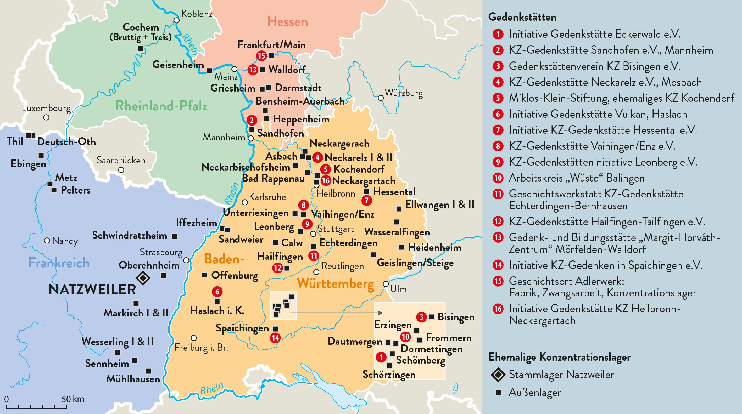 Als die Front der Alliierten immer näher heranrückte, wurden im Spätsommer 1944 die linksrheinischen Außenlager und das Stammlager geräumt, gleichzeitig entstanden weitere neue Außenlager rechts des Rheins im Südwesten. Insgesamt werden mehr als 50 Natzweiler-Außenlager gezählt, die meisten im heutigen Baden-Württemberg, aber auch in Hessen und in Rheinland-Pfalz.