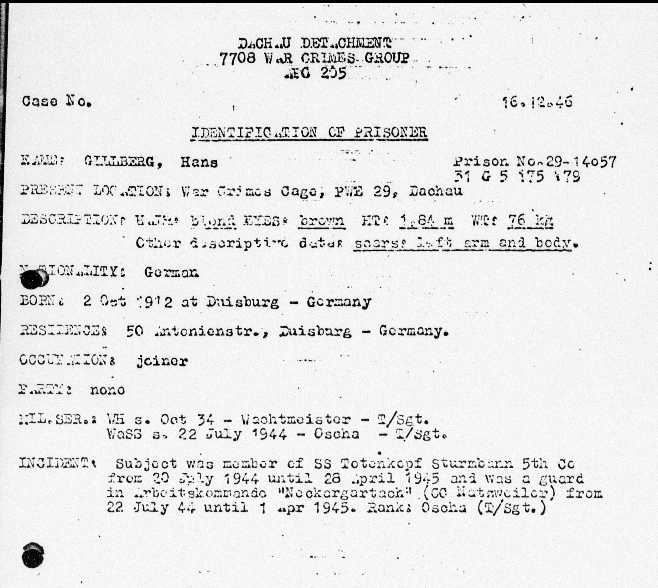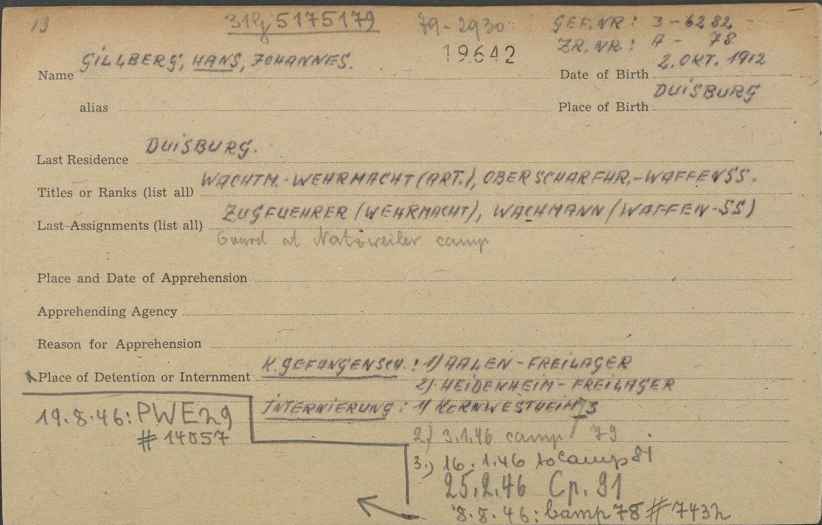 Im Frühjahr muss er den Amerikanern kurzzeitig entkommen sein, denn er machte sich mit seiner Freundin Schumacher von Bayern aus auf in Richtung Neckargartach. Dabei verdienten sie sich in Scheppach bei Öhringen durch Erntemithilfe ihren Unterhalt. Gillberg wurde dort von den Amerikanern verhaftet und in zwei Kriegsgefangenen- sowie fünf Internierungslagern festgehalten. Das letzte dieser Lager ist ab dem 19.8.1946 Dachau (PWE 29). Dort wird am 16.12.1946 der Personalbogen (unten rechts) erstellt.